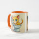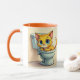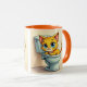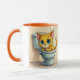 Lustigt tecknad teckning av en gult katt med stort blått ögon i en toalett