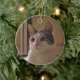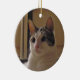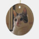 mestadels vitkatt med tabbyhuvudteckning på en rundaprydnad. Banditen var en gammal rädding för 3 wk på en hållplats, nu en lycklig 8 år den gammala huskatten.