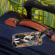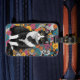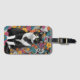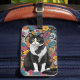 En svart- och vit kattplats omgiven av en mängd ljusa blommor av färgad i skuggor av orange, blått, rosa och gult. Bakgrunden är fylld med ett tätt, invecklat blommönster som framhäver kattens fängslande gult ögon.