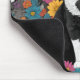 En svart- och vit kattplats omgiven av en mängd ljusa blommor av färgad i skuggor av orange, blått, rosa och gult. Bakgrunden är fylld med ett tätt, invecklat blommönster som framhäver kattens fängslande gult ögon.