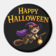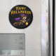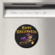 Fyll din köksskåp eller kontor med förtrollning med denna magiska randig häxkattunge runda kylskåpsmagnet. Denna underbara accessoar visar en bedårande randig kattunge och en lila häxhatt och kappa som flyger genom natten på sin kvast med en glödande lykta mot en djup svart bakgrund med en fet guldbold glad Halloween-hälsning. Denna högkvalitativa magnet är det perfekta sättet att visa din högtidssanda