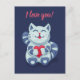 Kattunge med ett vykort "I kärlek you" med en söt digital illustration som skildrar en lycklig blå katt i kärlek. Det lilla kattdjuret ler och håller ett stort rött hjärta.