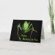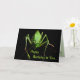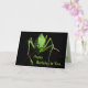 Detta födelsedagkort presenterar en livlig grön katydid på en ren svart bakgrund. Mer katydids är inre. De är medelstora till stora insekter. De är vanligt gröna, ibland med brun teckning och kamoufleras för att blanda med löven som de matar på. Deras mycket långa antennae skiljer dem från gräshoppor. Sett upp slut, verkar de för att vara utomjordingar från rymden! All text kan skräddarsy för att passa ditt speciella tillfälle.