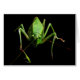 Detta noterar kortsärdrag en livlig grön katydid på en ren svart bakgrund. Katydids är medelstor till stora insekter. De är vanligt gröna, ibland med brun teckning och kamoufleras för att blanda med löven som de matar på. Deras mycket långa antennae skiljer dem från gräshoppor. Sett upp slut, verkar de för att vara utomjordingar från rymden!