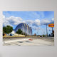 Sunshine belyser kurvor i Kauffman Centre for the Performing Arts i centrala Kansas City, Missouri. Omkostnader är högar av fluffa moln. Kauffman Centre for the Performing Arts ligger i Kansas City, Missouri. Det dramatiskt tittar byggnaden ligger nära Power and Light Center, Sprint Center och Crossways Arts District. I förgrunden finns en mural på byggnaden till lämnat och en restaurangskylt på högerna. Moshe Safdie, en prisbelönt modernare, var ledande arkitekt. Strukturen på 285 000 kvadratfot (26 500 m2) var en av de mest komplexa strukturerna i världen att utforma och bygga och var under uppbyggnad i nästan fem år. Centrumets yttre består av två symmetriska halva snäckor lodrät, koncentriska bågar som öppnas mot söder. Varje snäcka har en ljudplats för oberoende-prestanda, även om bakgrundsscenområdet är delat. Centrumets södra fasad består helt av glas.