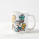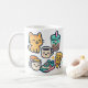 En bra kawaii mugg-design med en leende katt, bubbelte, pizza, smyakers och kaffe. Perfekt för roligt och vardaglighet. 🐱 🍕 🥤 ☕ ✨