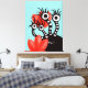 Cute monster canvas-konst med en svart tecknad med fyra öga på långa svarta och vita strimlade stammar som leende, gömt i abstrakt röda tulpaner.
