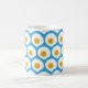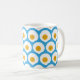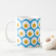 A repeat pattern of happy fried eggs sunny side up on a blue background.
