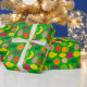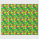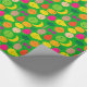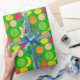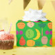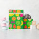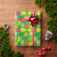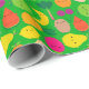 Ett gulligt mönster av lycklig frukt på en grön bakgrund, inklusive äpplen, orangar, bananer, ananas, körsbär, pears, persikor, en kiwi och en rabarber.