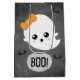 Cute Halloween-presentväska med ett leende spöke med rosyskon, en orange och "Boo!" text på mörkens bakgrund. Perfekt för barn Halloween fest är för, klassrumsbehandlingar eller utdelar godis på tricket eller Behandla natten. En roligt och familjevänlig design för Halloween.