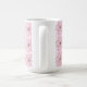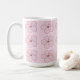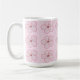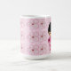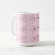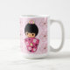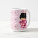 En gullig mugg som presenterar en kokeshidocka i en rosa kimono med en gullig gul hatt på en körsbärsröd blommarbakgrund. En rolig kombination av japansk traditionell konst och den flirty kawaiien utformar.