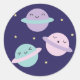 Cute planets med kawaii ansikte och små stjärnor i rymden. Pastel färg på mörk blått bakgrund.