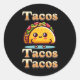 Lustigt klistermärken med en söt Kawaii-tecknad taco-dans. Vintagen säger: tacos, tacos, tacos.