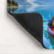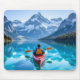 Mousepad with an illustration of a man kayaking in the ocean by the snow topped mountains. Pretty serene blue tranquil water and pine trees surround him on a peaceful journey.