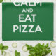 Keep Calm and Eat Pizza design featuring a cartoon pizza slice and bright red typography. Perfect for pizza lovers and foodies who love funny pizza quotes. Great for tees, posters or gifts.