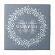 Blommigt Kalligrafi Typografi Monogram Ceramic Tile in Dusty Blue and White - Snyggt blue and white monogrammed keramisk plattform för nytillkomna par som har ett monogram av anpassningsbar, groom & bride namn, efternamn och bröllop datummallar omgivna av en fet blommigt konsans. En tankfull keepsaké för ett pars uppvärmning av party eller bröllopspresent. ©Swewhimsypaperie