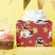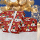 Papper julomslutning med en illustration av en söt kejsarpenguin med en röd julhatt; för barn för julens helgdag; för barn för utformning av julens tecknad, på röd bakgrund med anpassadets textmall för ditt namn eller meddelande, illustrerad av Radka Kavalcova