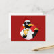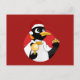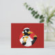 Vykort med en illustration av en söt kejsarpingvin med en röd tomtehatt; Jul tecknad design för barn, på en röd bakgrund
