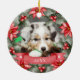 Klassisk blomsterinramad julgranskugga för husdjur i keramik. Fånga din hund eller katt älsklings julstämning med denna charmiga två-foto julgranskugga, vackert inramad av en akvarell poinsettia och en grön stjärna på båda sidor. Varje sida är designad med ett festligt rött band längst ner, kompletterat med söta vita tassavtryck för en lekfull touch. Framsidan visar ditt husdjurs namn och året, medan baksidan visar året igen i större storlek, vilket gör denna till en verkligt personlig souvenir. Denna anpassade julgranskugga ger en traditionell, botanisk prägel med rika röda och gröna nyanser, perfekt för djurägare som vill fira sin valp eller hund på ett festligt och minnesvärt sätt. Perfekt som en gåva