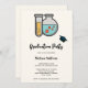 Inbjudan till studenten med en söt illustration av ett provrör som innehåller gult vätska och en rundad kolv/bägare som håller grönt vätska med röda bubblor.