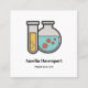 Affärskort med en söt illustration av ett provrör som håller gult vätska och en rundad kolv/bägare som håller grönt vätska med röda bubblor.