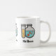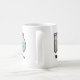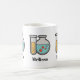 Ett mugg med en söt illustration av ett provrör som håller gult vätska och en rundad kolv/bägare som håller grönt med röda bubblor.