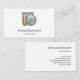 Affärskort med en söt illustration av ett provrör som håller gult vätska och en rundad kolv/bägare som håller grönt vätska med röda bubblor.