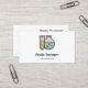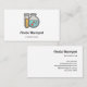 Affärskort med en söt illustration av ett provrör som håller gult vätska och en rundad kolv/bägare som håller grönt vätska med röda bubblor.