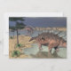Två kentrosaurus dinosaurs som går i vatten bredvid sand och träd vid grått-dagen