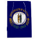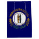 Placed on a navy blue field is the seal and words "Commonwealth of Kentucky". The two people on the seal, a pioneer and a statesman, represent all the people. They are acting out the meaning of Kentucky's motto: "United We Stand; Divided We Fall". Sprays of goldenrod extend in a half circle around the picture.