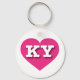 Den här nyckelringen har ett pulserande shock rosa som innehåller det feta, vita, övre fodral brev KY, förkortningen officiell för Kentucky, blågrästillståndet.