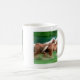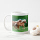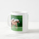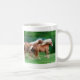 Para av palominohästar som är snabbt växande i en tävling över en keramisk mugg för fält.
