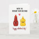 This greeting card shows two cute condiment bottles centered on a plain white background. A shiny red ketchup bottle with a red cap stands next to a golden-yellow mustard bottle with a yellow cap, and they look like best buddies. Each one has small black dot eyes, big crescent smiles, and soft pink blush on their cheeks, like they’re a little shy and happy. A single pink heart floats above and between them, tying the pair together in a sweet way ❤️. Across the top, the text “YOU’RE THE KETCHUP TO MY MUSTARD” appears in black, all-caps block letters that are easy to read. Near the bottom, “happy valentine’s day!” is written in dark red cursive script with a friendly, handwritten feel 💌. The bright red and yellow colors stand out strongly against the white space, keeping the focus on the message of affection 🍫. Hope it helps you share kind Valentine’s Day sentiments with someone you care about.