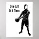 En svart vektor av en smal och vältränad man som gör lyft med en kettlebellvikt. Negativt utrymme används för konturerna. Texten lyder "Ett lyft i taget" som är en påminnelse om att det inte finns någon genväg till fitness och att vara smal och se bra ut. En förändring är bara möjlig med varje ansträngning som görs. Du kan också anpassa till ditt eget meddelande.