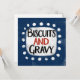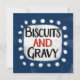 En roligt och söt typografisk sydlig livsmedelsdesign som säger "Biscuits and Gravy". Den har svart och röd text på en vit rektangel med funky, lekfulla vita prickar runt den, allt på blå bakgrund.