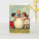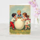 This design shows three rosy-cheeked children—two boys and a girl—clustered close together around an oversized cracked white egg in a grassy outdoor scene. A fair-haired boy in a sailor-collared top faces outward with a bright grin, while the other two lean in toward the opening, their shoulders nearly touching in a friendly, conspiratorial way. The dark-haired boy wears red trousers, and the girl wears a white dress with red floral details and a long red bow at her waist, adding a gentle, affectionate touch to the group’s closeness. From the jagged break in the shell, a tiny yellow hatchling peeks out, drawing all three sets of eyes toward it like a shared secret 🐣🌷. Behind them, a pale blue sky with thin, wispy clouds keeps the scene light and open. Near the top, a short Easter greeting sits in small, soft-colored lettering, centered above the children without covering the main artwork. The egg’s sharp cracks frame the little yellow face, and the green grass below is brushed in soft strokes around their feet 🐰.
