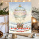 A magical ornament-shaped hot air balloon carrying children over snowy rooftops. Playful watercolor scene perfect for imaginative kids. A festive and adventurous Christmas greeting.