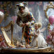 This unique 3D photography artwork captures a tender moment of love between a mother and her daughter. The mother, dressed in a vibrant harlequin costume in shades of yellow, blue, and red, watches over her little girl, who wears a delicate white silk dress. The scene radiates not only visual beauty but also a deep bond of protection, joy, and gentle affection.