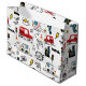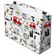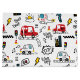 A playful, cartoon-style city pattern featuring buses, cars, helicopters, traffic lights, buildings, and fun doodle text like “Beep Beep,” “Wuz Up?” and “Go,” in bright red, yellow, blue, and black tones.