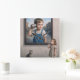 A small girl stands next to an intriguing framed picture of a boy holding a tin can connected by a string, as if they are communicating.