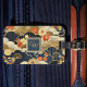 Denna resväskas etikett har ett japanskinspirerat tryck - liknande mönster från kimonon - med vitt, turkost, tan och orange på mörkt turkost-- nästan svart. Din namninitial i monogram visas i guldbokstäver på en koordinerad färgblock av mörkt blåturkost, kantad med guld. Denna kimonoinspirerade asiatiska tryckkudde är en vacker accent för hemmet eller en present till en husvärmning, eller en vän eller nära och kära.
