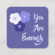 Visa stöd med Kindness Cards! Det är kort av kvadratisk affärskort med positiva och inspirerande ord att dela ut till vänner, gömma i en familjemedlem eller lämna en främling att hitta för att göra sig bättre av med sin dag. I denna design ingår blommor i lila- och vita nyanser. Texten "Du är tillräckligt" är för att påminna någon om att de är tillräckligt bra, tillräckligt smarta, tillräckligt vackra och starka.