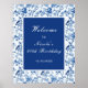 Vacker välkomstskylt för födelsedagsfest med kineseri blå fåglar och blommor. Perfekt för ett vår- eller sommarbröllop. Orden kan ändras för att passa dina egna detaljer eller krav.
