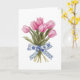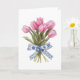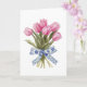 Denna eleganta gratulationskort innehåller en fantastisk illustration av en bukett med livfulla rosa tulpaner, sammanbundna med ett ömtåligt blått chinoiserieband med invecklade blommönster. Den mjuka, krämfärgade bakgrunden framhäver de levande färgerna hos blommorna och bandets invecklade detaljer och skapar en tidlös och sofistikerad design som passar för alla tillfällen. Oavsett om du skickar födelsedagsönskningar, uttrycker tacksamhet eller bara lyser upp någons dag, utstrålar detta vackra kort charm och omtanke, vilket gör det till ett underbart val för dina nära och kära.