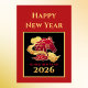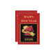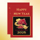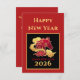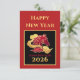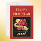 Glad nyår 2026 Lunar Nyår röda, gulda och svarta kort med Year of the Horse stiliserad konst. Texten är anpassningsbar om du önskar. Framsidan av detta kort har texten "Glad nyår" och "Lunar Nyår 2026" plus en stiliserad häst bland fancy rullande moln. Baksidan av detta kort har gul text: "Önskar dig lycka och välstånd. Må detta nya år ge dig god hälsa och gott öde." Se till att uppdatera ditt familjenamn eller ta bort namnet om du föredrar att skriva under med en penna.