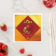 Enkelt gyllene tiger pappert skuren i en dekorerad cirkel med kinesiskt lantern och gyllene Fu-ideogram (Tur), blommar och kinesiskt hälsning i små cirklar under tigern + "Tiger-året" i hand med stil + Fu-ideogram som bakgrund på en guldtexturerad papper (bildtryckt). Utformning av den pappra napkin från party för kinesiska nyåret för tigern 2022.