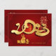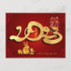 Kinesiska rackare som bakgrund för ett stort gyllene 2023 med hälsning på kinesiska inuti numret + "LYCKLIG CHINESE NEW YEAR" och guldfärgad papper bild (tryckt bild) av kanin. Utforma vykort för vågräts helgdag med samma bakgrund bakåt. Matchar hälsningskort, inbjudan och mer snart...