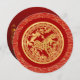 En elegant av en gyllene häst med blommar i en cirkel (inspirerad av traditionell kinesisk papper klippning) med röd cirkel täcker över en röd och gult traditionell asiatisk mönster + grafisk "GOTT NYTT ÅR" på kinesiska och engelska och gammal kinesisk kalligrafi för "häst" på högerna på gradiant red färg. På baksidan finns samma övertoningsbakgrund för texter som ska anpassas: ditt budskap och namn + samma röda pappra utfällning i liten storlek. Utformning på runda platta kort. Du kan enkelt anpassa det här nyårskortet för Lunar genom att anpassa hälsning på baksidan eller ta bort för din handskrivna anteckning. Matchande gratulationskort, vykort för helgdag och platta kvadratiska kort.