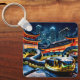 Serpent på en kullerstensgata i en gammal kinesisk stad med skyscraper i bakgrunden. Utforma på den grundläggande fyrkantiga nyckelkedjan med "Året för ormen". Perfekt för kinesiska nyåret för ormen 2025 eller födelsedagen (människor födda under ormåret).
