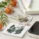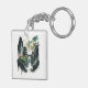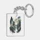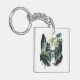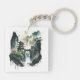 En vacker fyrkantig nyckelkedja som visar ett landskap i bläck med gammal kinesisk arkitektur och stora vattenfall.